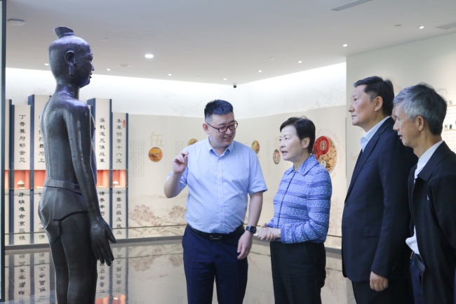 刘洋董事长对林郑月娥长官一行表示热烈欢迎,并陪同走进维康医药大健康产业园,参观了维康中药博物馆,并介绍了企业产业布局、产品研发创新、未来发展规划、以及中医药文化传承等方面的情况。